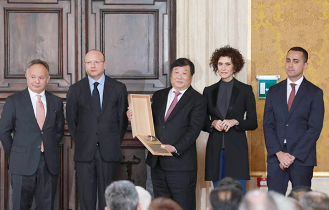 当地时间3月20日上午11时,2018年度意大利莱昂纳多奖颁奖典礼在罗马巴贝里尼宫举行。潍柴集团、意大利法拉帝集团董事长谭旭光荣获“莱昂纳多国际奖”,以表彰他在战略重组意大利法拉帝集团及中意两国经济交流中做出的突出贡献。意大利总统塞尔吉奥·马塔雷拉、意大利总理朱塞佩·孔特、意大利副总理路易吉·迪马约、意大利驻中国大使谢国谊、中国驻意大利大使李瑞宇,以及美国、俄罗斯等九个国家的大使出席颁奖活动。